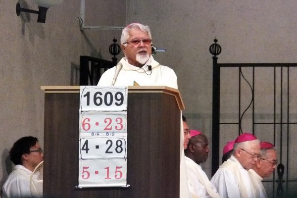 (写真は順番に、①広島の原爆ドーム ②8月5日夕方からのカトリックと日本聖公会との行事を記した案内板 ③合同プログラムであいさつする広島教区の白浜 満司教様 ④平和祈願ミサで説教する那覇教区の押川壽夫司教様 ⑤8月6日の原爆と戦争のすべての犠牲者のためのミサ ⑥津和野・乙女峠に到着 ⑦信仰を守り伝えてくれた人々に感謝して祈る。)