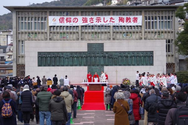 2月4日 日本二十六聖人殉教祭 Blog 2018.02.05 日本二十六聖人殉教者の祝日(2月5日)を前に、2月4日(日)14時から殉教記念ミサが西坂公園で行われ、約1300人が共に祈りをささげた。この日は二十六聖人を思うにふさわしい厳しい寒さとなり、時折、雪がちらつき強風が吹く中、参加者はかじかみながらも手を合わせ祈っていた。