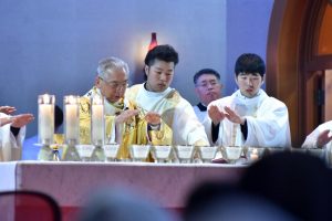 (写真は、連願、髙見大司教から聖香油の塗油を受ける新司祭、チョ大司教の祝福を受ける新司祭、続くミサの様子)