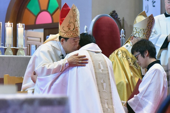 叙階されたのは、韓国・テグ大司教区のシンピョン教会出身、キム・ボム新司祭と桐教会出身の宮原大地新助祭。テグ大司教区からチョ・ファンギル大司教をはじめキム新司祭の同級生の司祭ら、また40人余の巡礼団が参列し、新司祭・新助祭誕生を浦上教会に集まったすべての人が共に喜び、感謝の祈りをささげた。