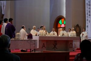 3月27日(火)浦上教会で髙見三明大司教主司式、90人以上の司祭団の共同司式により聖香油ミサが行われ、集まった多くの信者らが共に祈りをささげた。