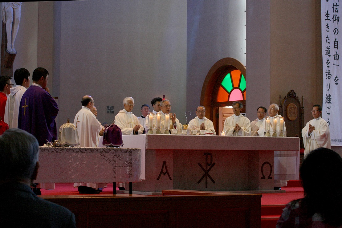 写真は、ミサが行われた浦上教会の永井千本桜、共同司式でささげられたミサ、聖体拝領、聖別される香油。