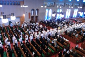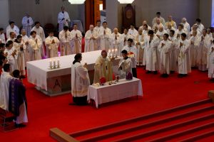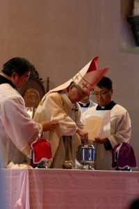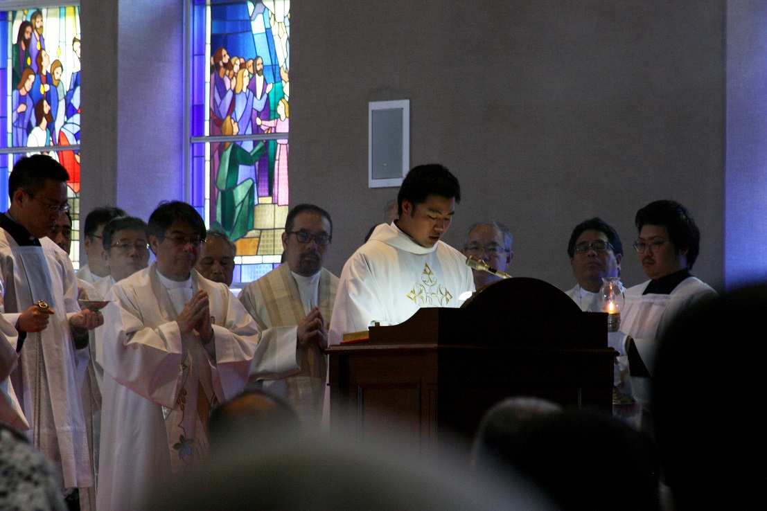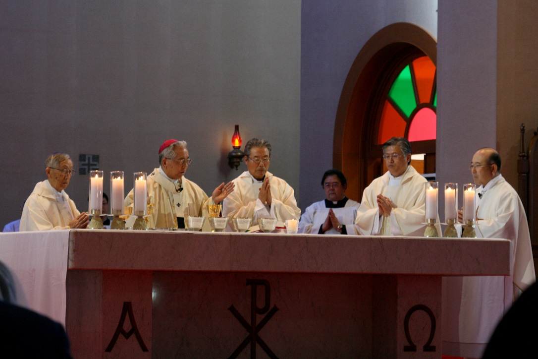 4月16日 聖香油ミサ Blog 2019.04.16 4月16日(火)10時半から浦上教会で聖香油ミサが髙見三明大司教主司式、80人余の司祭団の共同司式により行われた。本来このミサは祭司職の制定が記念される聖木曜日に行われるが、この日に教役者と信者が司教と共に集まることが困難な場合には復活祭に近い他の日を選ぶことができ、長崎教区では火曜日に行われている。ミサの終わりには、今年司祭叙階の節目(ダイヤモンド・金・銀祝)を迎えた司祭らのお祝い式があった。 写真は入堂、福音朗読、祭壇を囲む司教・司祭ら、聖香油の聖別。