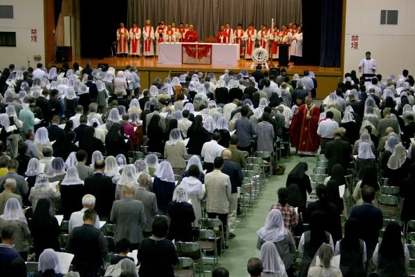 5月19日 雲仙殉教祭 Blog 2019.05.202019.05.22 雲仙殉教祭が5月19日(日)13時から雲仙メモリアルホールで行われ、各地から集まった約1,100人が、髙見三明大司教の主司式、25人以上の司祭団の共同司式のもと、祈りをささげた。 ミサ後は雲仙地獄のキリシタン殉教記念碑まで徒歩巡礼をし、大司教と司祭団、信徒らが共に祈った。 (写真は、ミサの初めに髙見大司教が、殉教者が拷問を受けた雲仙地獄からくみ上げた温泉水を参列者に振りかけている様子。)
