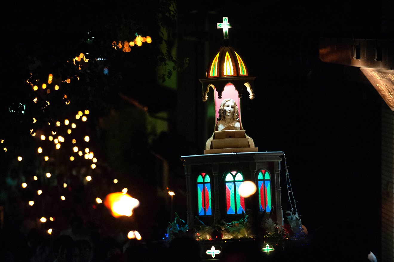 (写真はミサの様子と、被爆マリアを先頭に進むたいまつ行列)