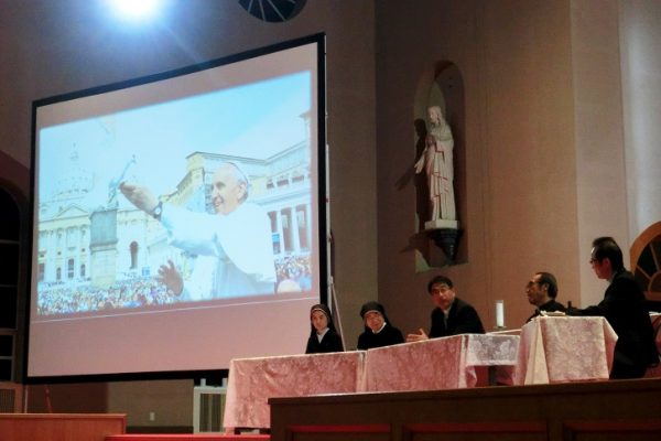 はじめに教皇フランシスコが教皇になるまでのドキュメンタリーDVDの鑑賞会があり、続いて司教・司祭・修道者による座談会があった(写真)。座談会では、カトリック学校の教育現場や教会学校、ローマ留学での体験を通して感じたこと、また1981年ヨハネ・パウロ2世教皇来崎当時の話を聴くことができ、短い時間ではあったが、さまざまな思いをめぐらせるとともに、近づく教皇来崎に向けて心構えをする機会となった。