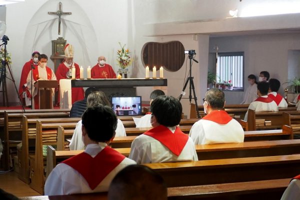 2月5日(金)17時から西坂・聖フィリッポ教会で、髙見三明大司教の司式による殉教記念ミサが行われた。今年は新型コロナウイルス感染防止のため2月7日予定だった長崎教区主催のミサが中止となり、日本二十六聖人の祝日のこの日に司祭のみが参加するミサがささげられた。天候に即した準備の都合上、ミサは聖堂内で行われた。