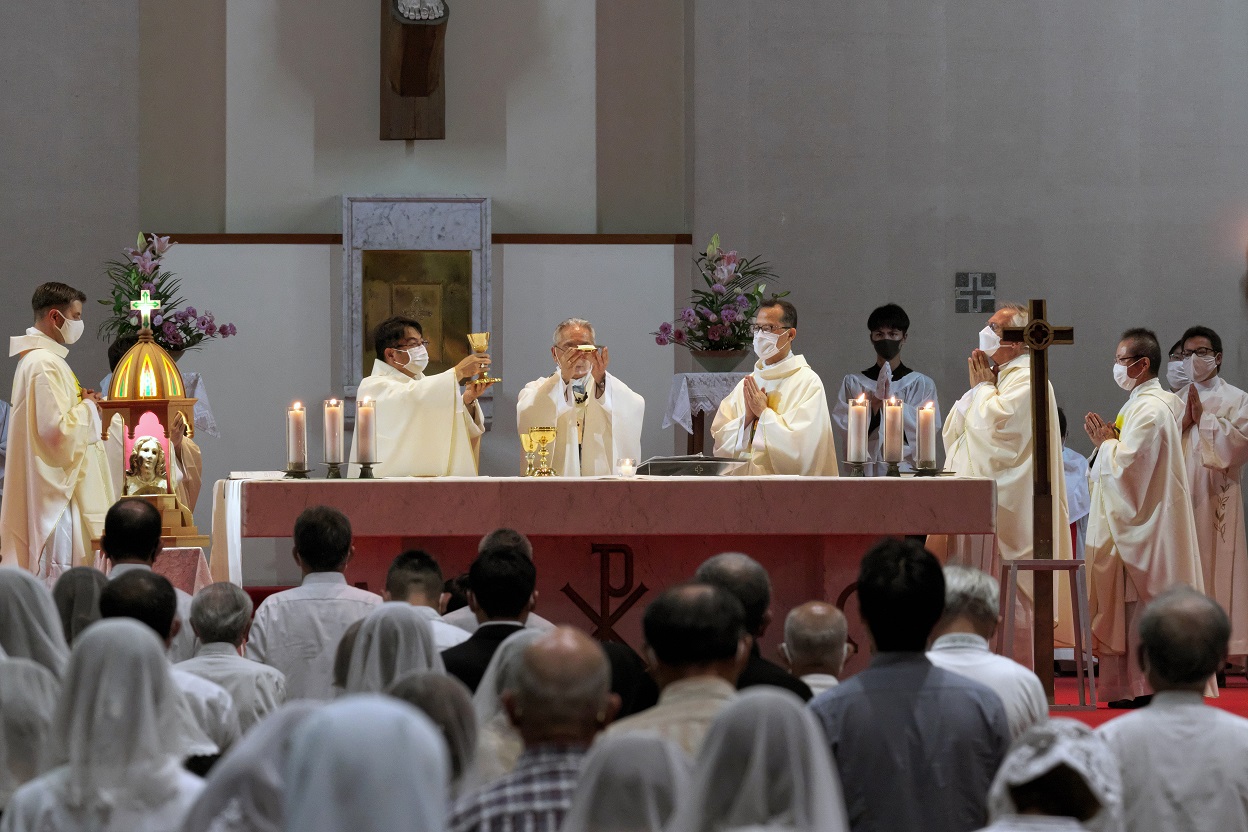 そしてロザリオを一連唱えた後、18時半からミサが始まった。髙見三明大司教が主司式をし、今年7月に来日し着任したばかりの新駐日教皇庁大使レオ・ボッカルディ大司教と参事官のヴェチェスラヴ・トゥミル神父、酒井俊弘補佐司教(大阪教区)、中村倫明補佐司教、6人の司祭団が共同司式を務めた。